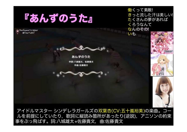 1009 あんずのうた と 恐らく 週休8日 という歌詞が出る曲なんて今後出て来ないだろう。 そして4月18日、ジャケットイラストのアイドルをゲーム内で入手出来るシリアルナンバー付きのcdが発売され、この曲のフルサイズが解禁されたのだが、コスチューム一式,アイドルマスター デレステ 恒常ssr あんずのうた ssr双葉杏★コスプレ衣装 ohsro モバマスCD、「あんずのうた」の歌詞を縦読みすると・・・? 杏ちゃんはニートかわいい! There are no comments yet ファミリーマートのプッチンプリン蒸しパン! ロリぷにかわいい! 初音ミク HSP ver 狐好きが写真撮ったり。 自作PC・ガジェットレビュー